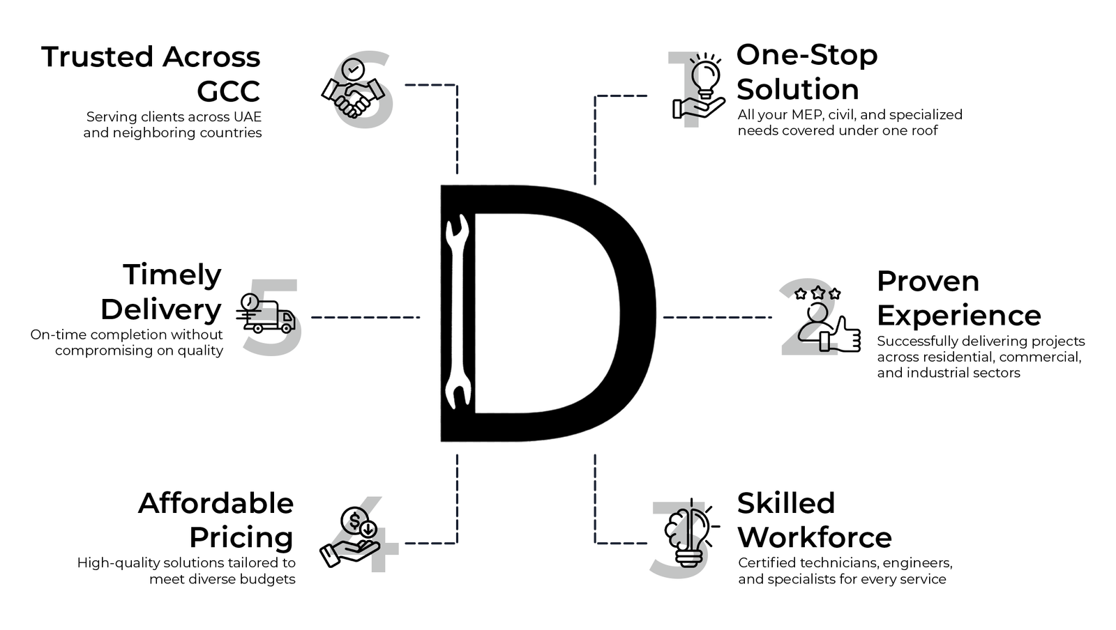 Operating across the UAE and GCC countries, our goal is simple: to provide dependable technical services that make your spaces safer, stronger, and smarter. From residential villas and offices to high-rise buildings and industrial projects, DTS brings precision, expertise, and commitment to every job.